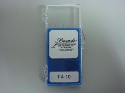 T-4 tips are for use in most standard commercial micropositioners for probing integrated circuits, pads, or lines. Each T-4 tip uses the same 10, 22, 35, 60, or 125 micron diameter tungsten wire as our Model 12C Picoprobe, but is mounted to a 0.020 inch diameter, 2 inch long tinned copper shaft.