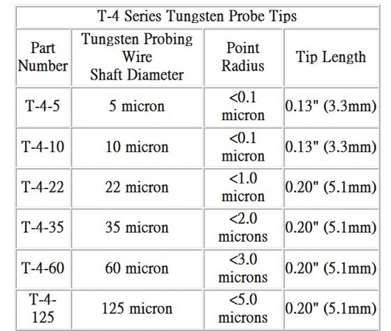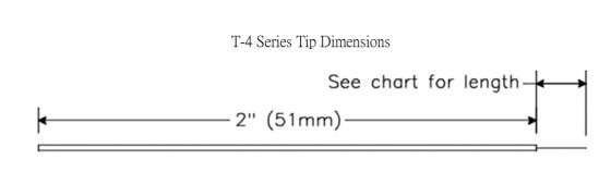 The T-4 Series utilizes various sizes of tungsten wire attached to a 0.020" (0.51mm) diameter tinned copper shaft.